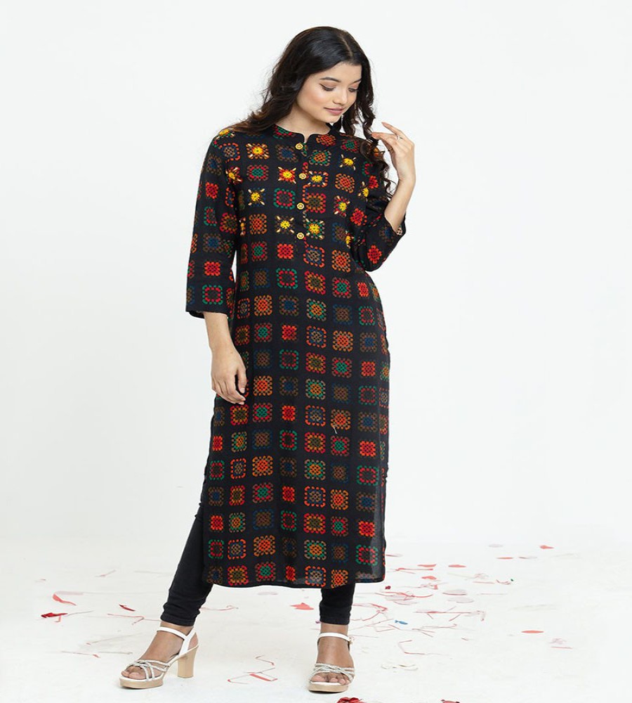 Product Type: Women Kurtis - Color: Black - Sleeve: 3/4 Sleeve - Best Production quality. Wash Instruction: - Machine wash cold. Gentle Cycle. Use only non-chlorine. Tumble dry low. Warm iron as needed. Made in Bangladesh Material & Care 100% Cotton/ print